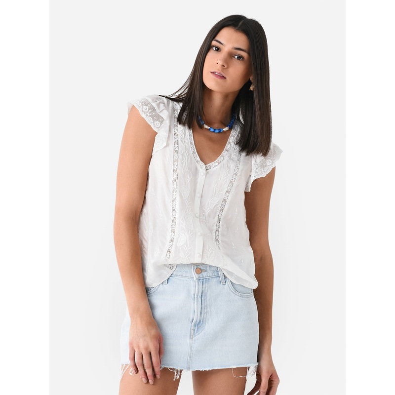 DESCRIPTION:Embroidered top with flutter sleeves and lace detailing.FEATURES:TopV-NecklineShort Flutter SleeveButton-Down FrontLace TrimsEmbroidered Detailing100% SilkClassic FitModel is wearing size Small top.Model's Measurements: Height: 5'9.5" | Bust: 3