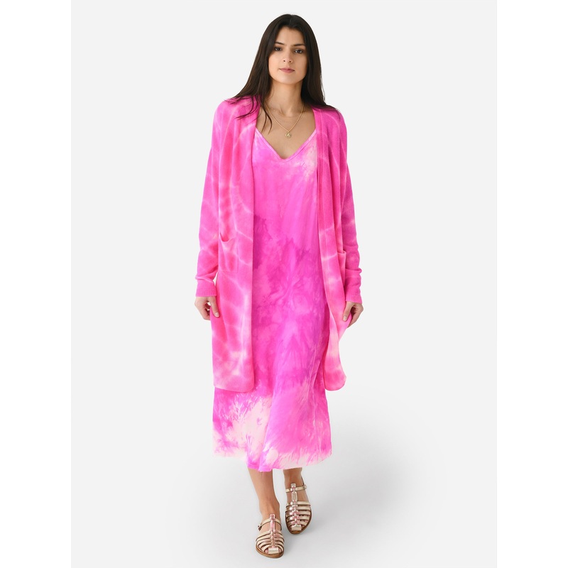 A cozy open-front cardigan made from sumptuous cashmere with a bright pink tie-dye print.