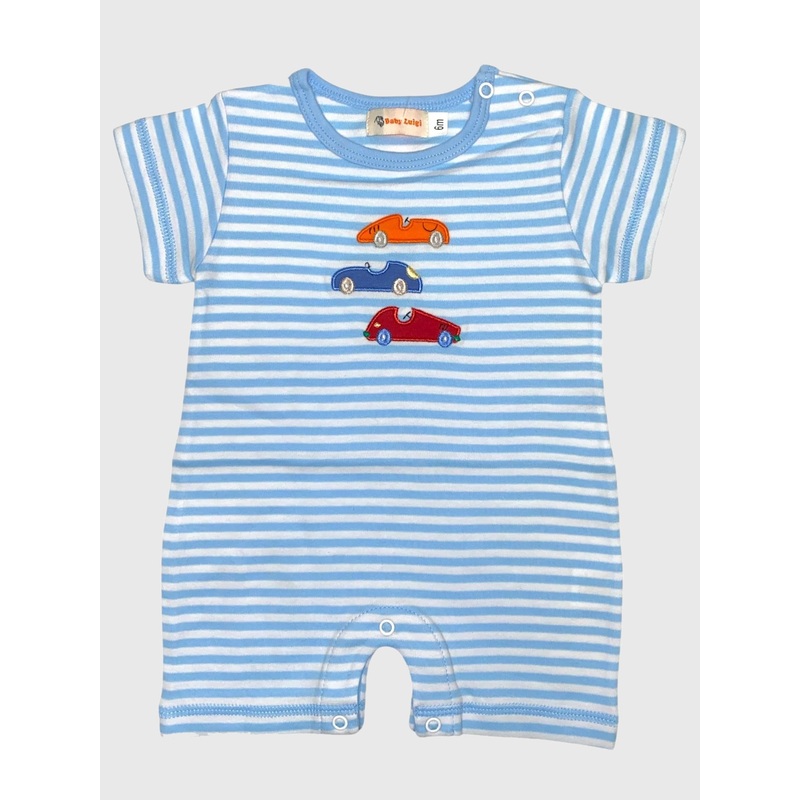 A striped romper made from soft cotton with embroidered car graphics and an easy snap closure.