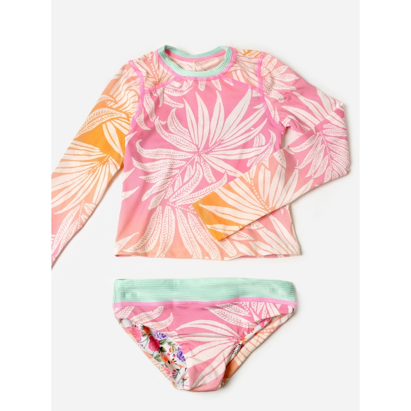 DESCRIPTION:A colorful ombre rash guard bikini set with a tropical print and reversible design.FEATURES:Round NecklineMatching BottomAll-Over Novelty PrintFull CoverageFully Reversible46% Polyamide, 34% Recycled Polyamide, 20% SpandexClassic Fit