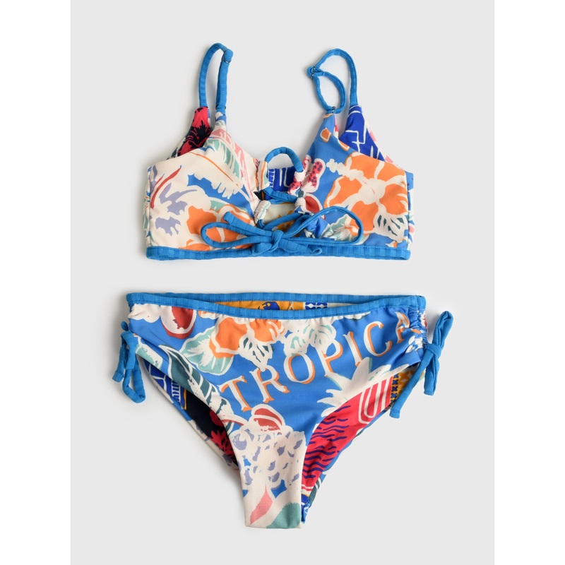 DESCRIPTION:This reversible bikini set features a tropical print and offers a versatile design with four looks in one.FEATURES:Scoop NecklineThin, Adjustable StrapsBack Lace Up DetailMatching Bikini BottomSelf-Tie SidesFull CoverageAll-Over Novelty PrintFu