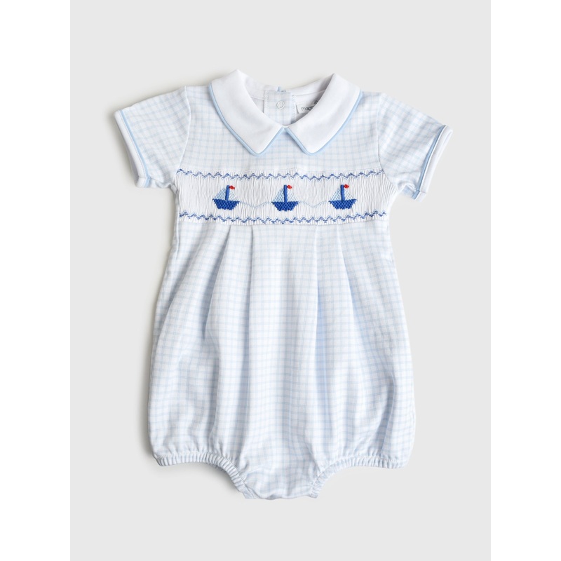 This gingham-printed bubble is made from soft Pima cotton and features a Peter Pan collar and sailboat embroidery.