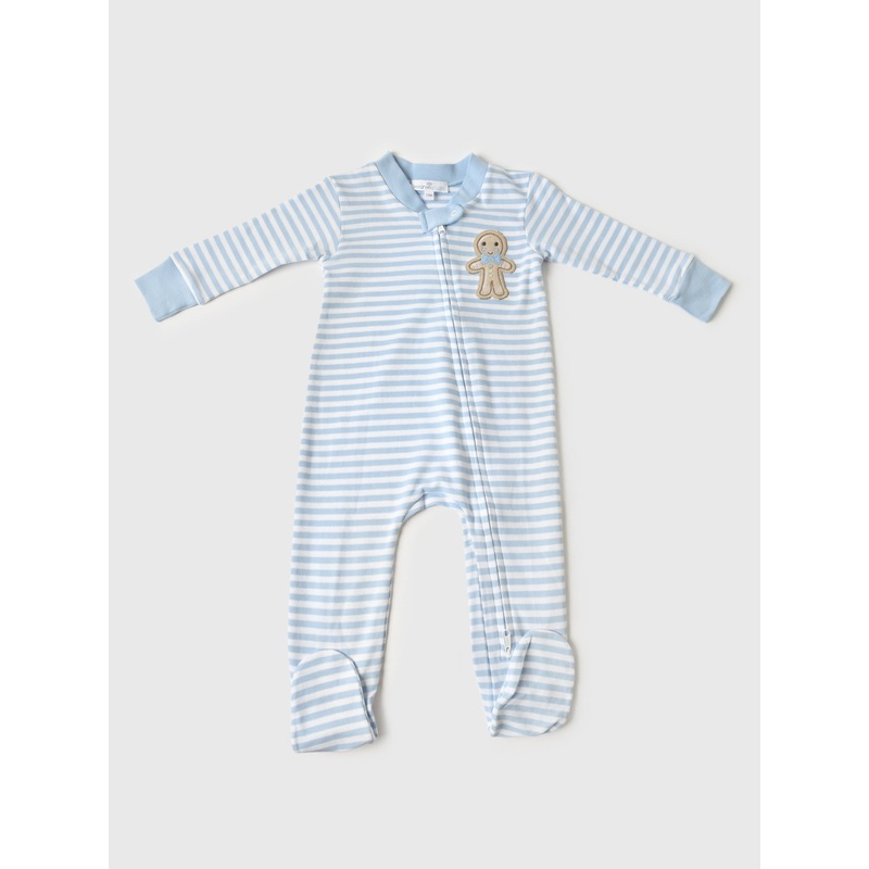 A blue and white striped footie made from soft Pima cotton with a charming gingerbread appliqu detail.
