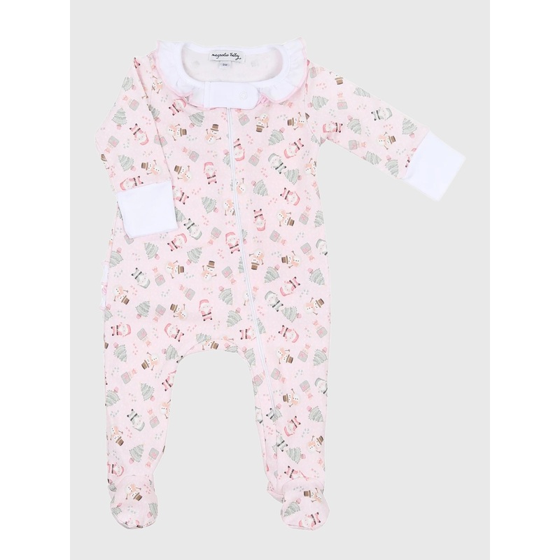 DESCRIPTION:A soft Pima cotton zipper footie featuring a festive Christmas print on a light pink background.FEATURES:Round NecklineRuffle TrimBanded CuffsFull Zip ClosureEnclosed FeetAll-Over Novelty Print100% Pima CottonClassic Fit