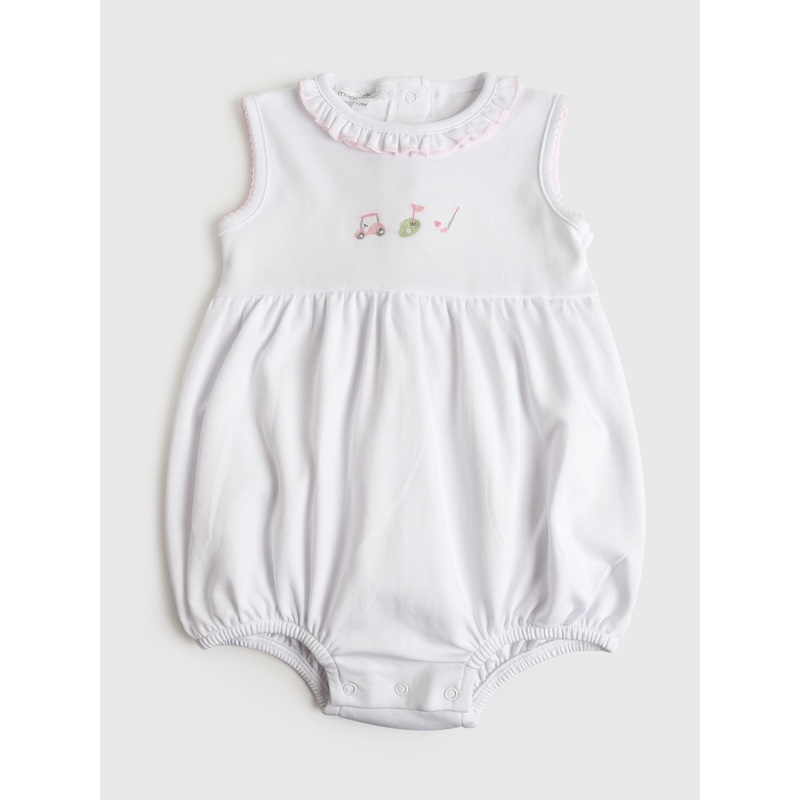 DESCRIPTION:This cute little bubble is made from soft Pima cotton and features a ruffle-trimmed neckline and an embroidered gold design.FEATURES:Round NecklineBack Button ClosureRuffle TrimEmbroidered DesignElastic Leg CuffsSnap Closure100% Pima CottonClas