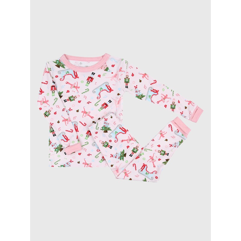 A super soft Pima cotton pajama set featuring sugarplum fairies, toy soldiers, and nutcrackers dancing across a soft pink background.