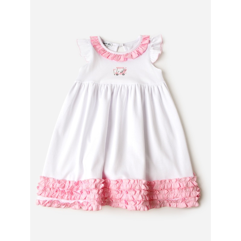 A lightweight dress made from Pima cotton with contrast ruffle details and an embroidered golf cart design.