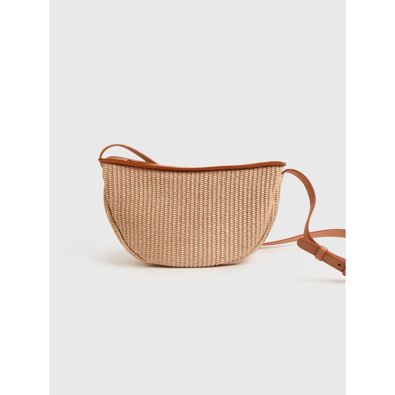 DESCRIPTION:The Moon Sling features a sleek, crescent-shaped design with beautifully rounded edges. This crossbody bag includes an adjustable strap and a canvas interior.FEATURES:Zip ClosureCanvas LiningItalian Woven RaffiaDimensions: 10.6 in. W (Top), 5.5