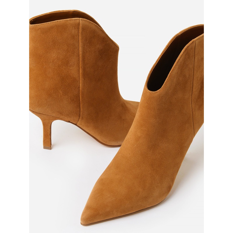 DESCRIPTION:Leather pointy toe heeled bootie.