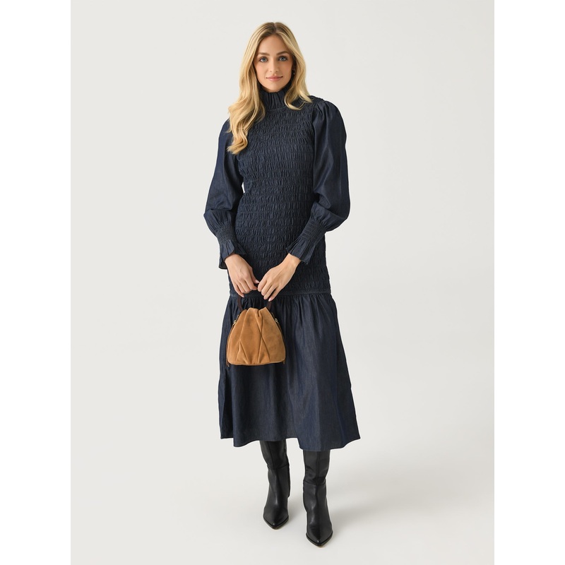 DESCRIPTION:A long, smocked dress made from denim fabric with ruffle trims and a gathered skirt.FEATURES:High NecklinePuff SleevesRuffle TrimsSmocked BodiceGathered SkirtMaxi Silhouette100% Cotton DenimClassic FitModel is wearing size Small dress.Model's M