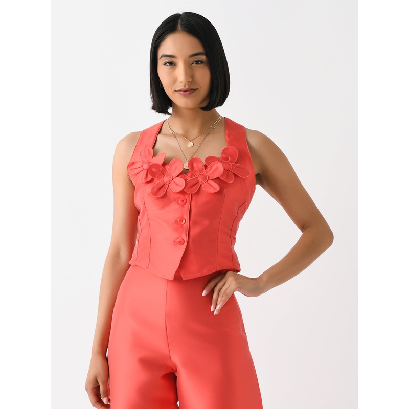 A bustier-style top adorned with appliqu flowers and cross-back straps.