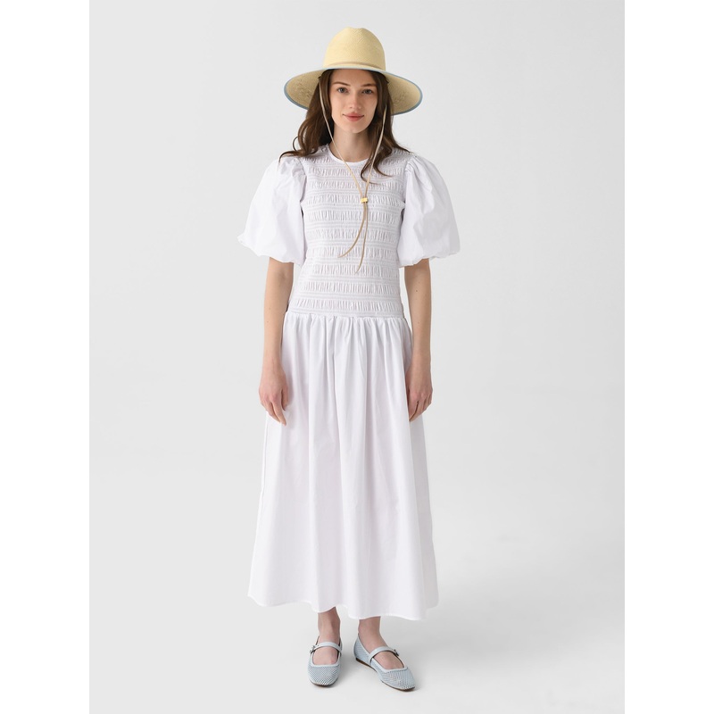 DESCRIPTION:This mid-length dress is made from lightweight cotton and features voluminous sleeves and a smocked bodice.FEATURES:Round NecklineBack Keyhole Button ClosurePuff SleevesSmocked BodiceMidi Silhouette100% CottonClassic FitModel is wearing size 36