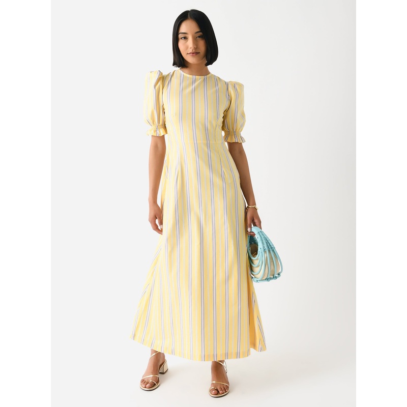 DESCRIPTION:A maxi-length dress made from striped cotton with puff sleeves adorned with ruffle cuffs.FEATURES:Round NecklineBack Keyhole Button ClosurePuff SleevesRuffle CuffsMaxi SilhouetteAll-Over Stripe Print100% CottonClassic FitModel is wearing size 3