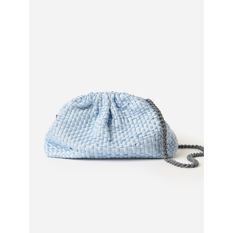 A medium-sized clutch made from woven satin ribbon fabric with an optional aluminum strap.