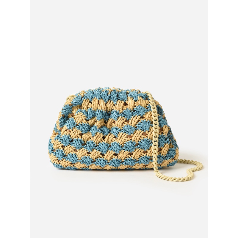 DESCRIPTION:A medium-sized clutch made from woven raffia with a removable strap.