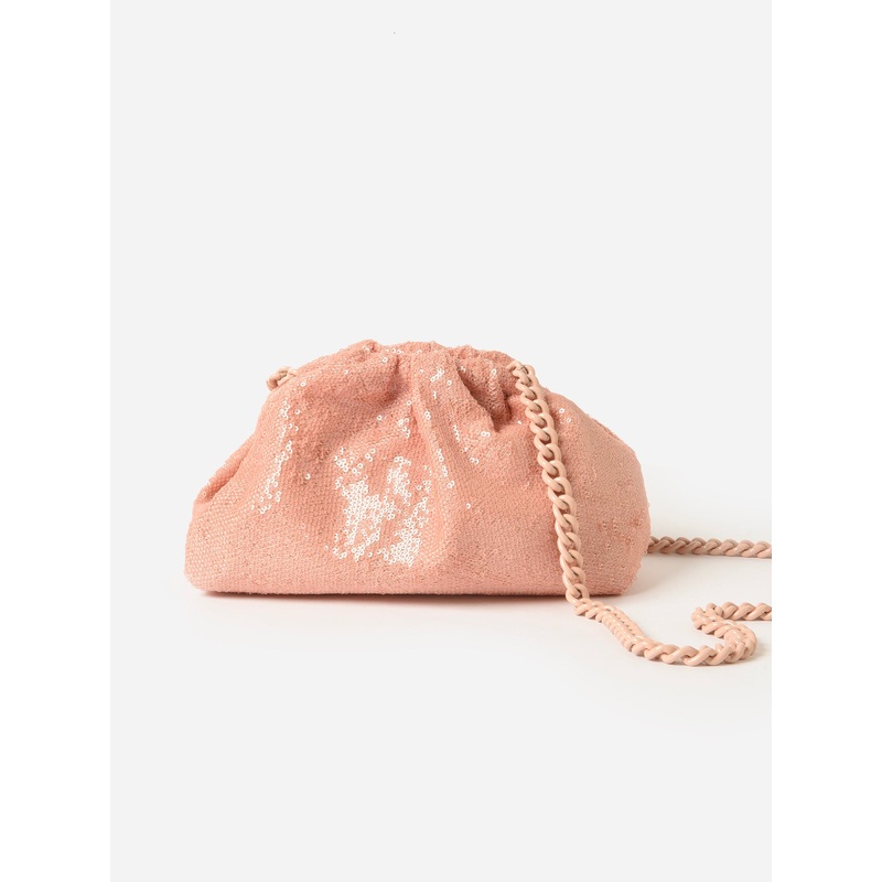 A mini-sized sequin clutch with a matching aluminum chain strap.