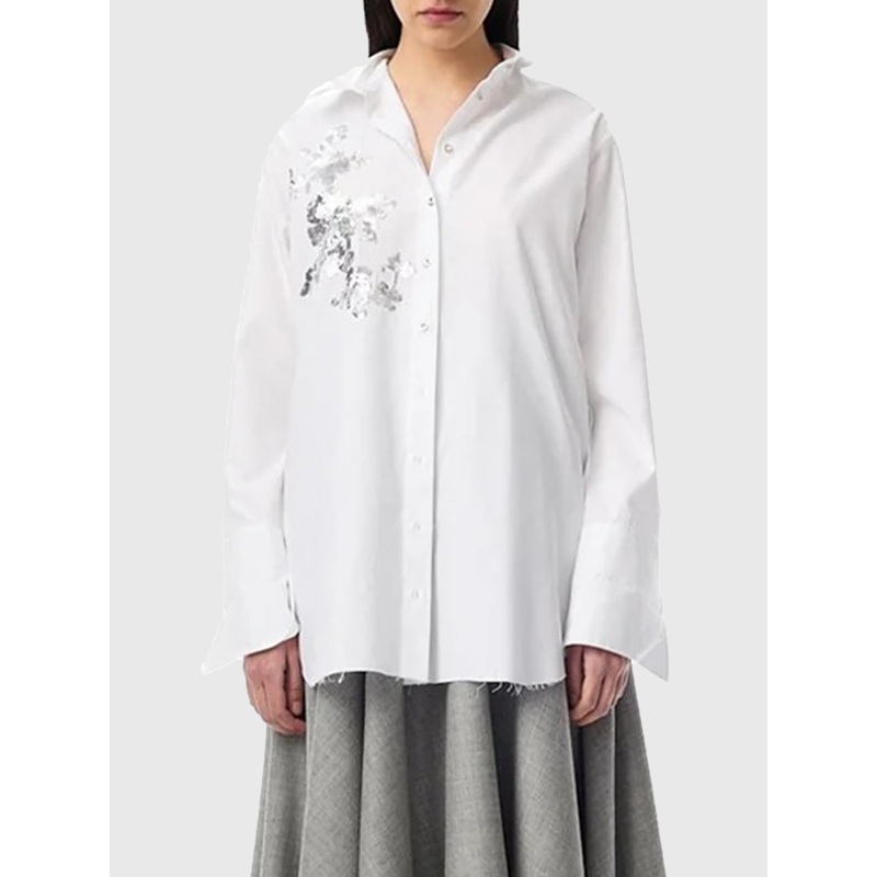 DESCRIPTION:This oversized white shirt presents a distinctive and contemporary take on a timeless classic. It features a relaxed fit, a frayed hem, and a drop shoulder design with long cuffs. One shoulder is embroidered with sequins, adding a touch of soph