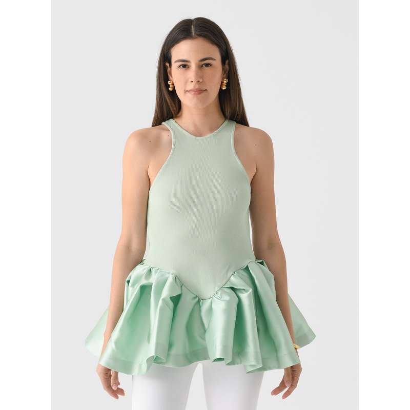 DESCRIPTION:This vibrant blouse features an eye-catching design of a ribbed bodice with a satin peplum hem.FEATURES:High NecklineSleevelessPeplum HemBodice: 97% Organic Cotton, 3% ElastaneHem: 100% Polyester SatinClassic FitModel is wearing size Small tank