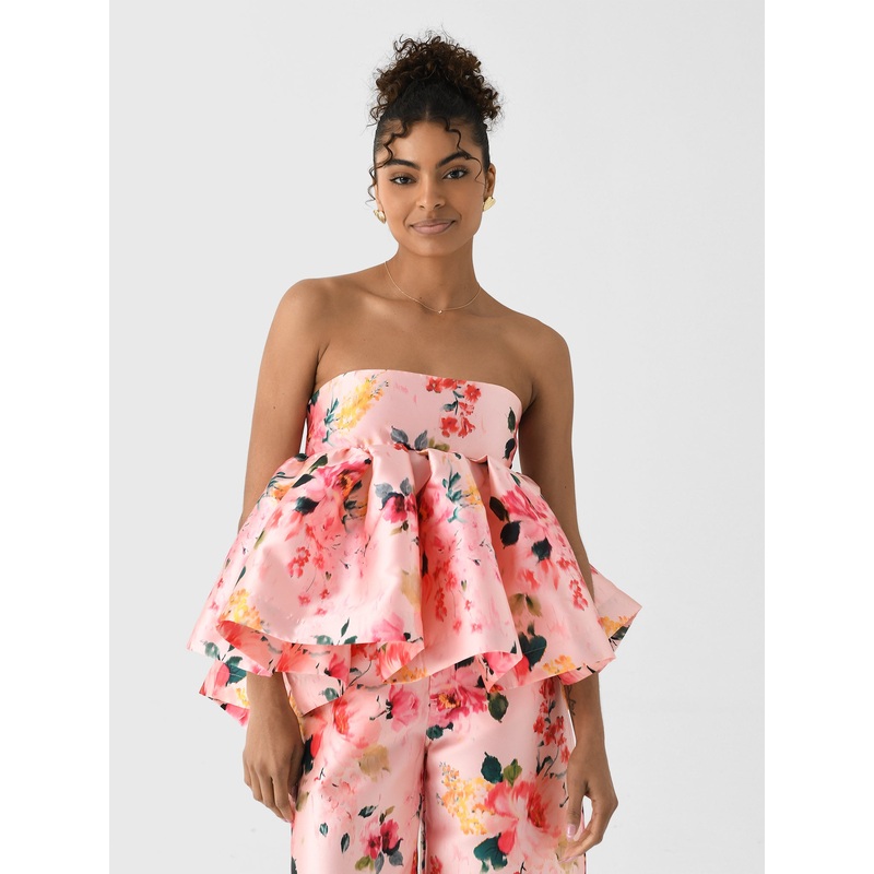 DESCRIPTION:This voluminous peplum top is made from lustrous satin and features a colorful floral print.FEATURES:Strapless NecklineBack Tie ClosurePeplum HemAll-Over Novelty PrintSatin Fabrication100% PolyesterClassic FitModel is wearing size US2/UK6 top.M