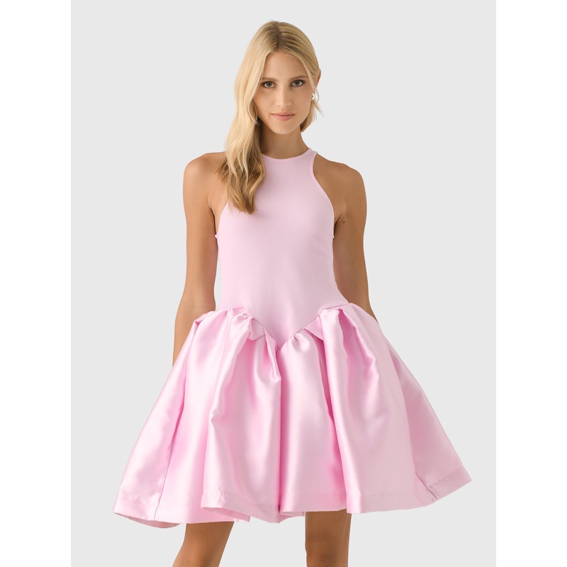 DESCRIPTION:Effortless elegance and modern chic combine in this stunning soft pink mini dress. It pairs a rib knit tank with a voluminous Mikado skirt for a look that's both romantic and on-trend.FEATURES:High NecklineSleevelessFull SkirtMini SilhouetteTop