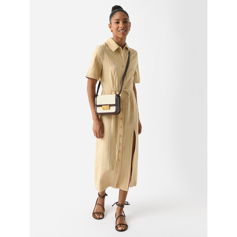 Casual, mid-length striped shirtdress made from a lightweight linen blend with a side slit detail and a self-tie belt for added shape.