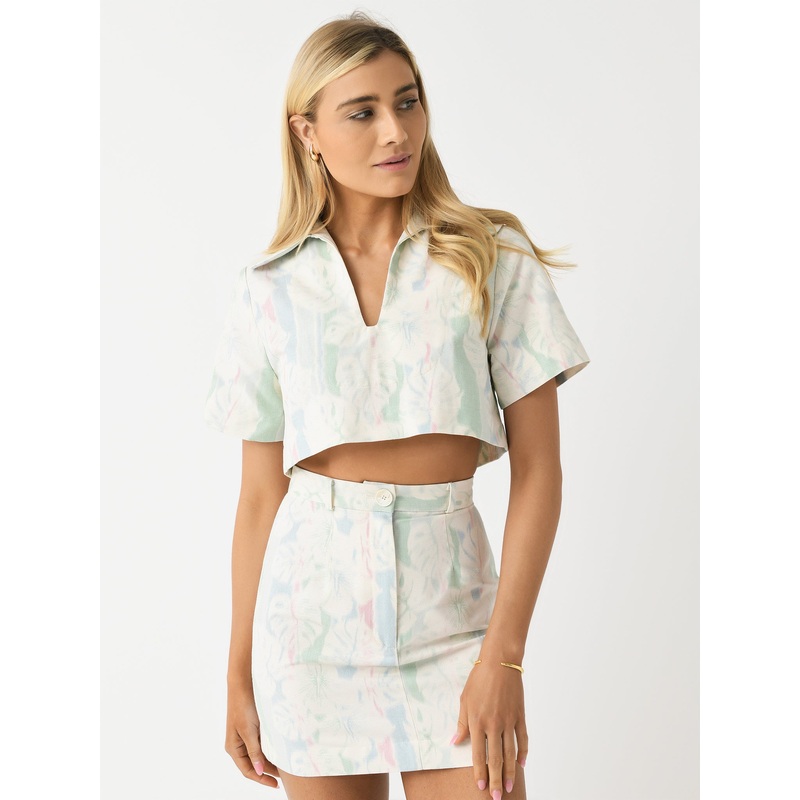 A short-sleeve popover shirt with a cropped silhouette and tropical-inspired print.