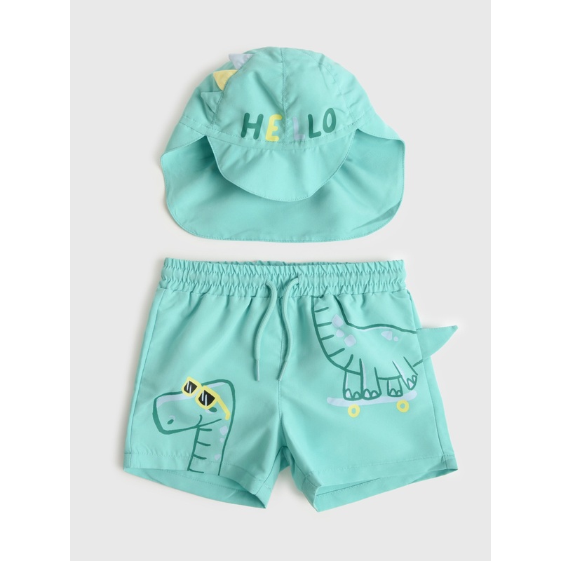 DESCRIPTION:This adorable set is perfect for your little dinosaur enthusiast! It includes a comfortable sun hat with a playful dinosaur design and a matching swim short with an elastic waistband for a secure fit.FEATURES:Elastic WaistbandAdjustable Drawstr