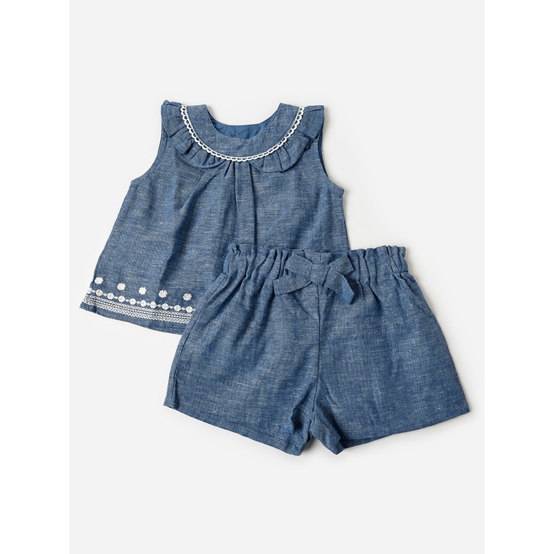 A matching top and short set made from lightweight linen and cotton with delicate contrast embroidery.