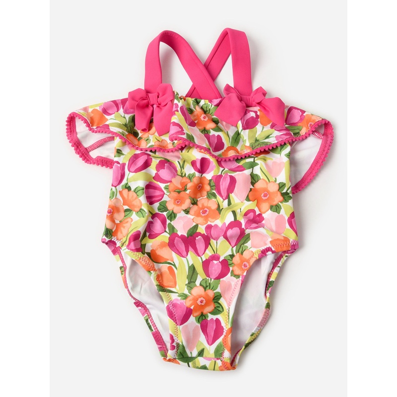 DESCRIPTION:A floral-printed one-piece swimsuit with criss-cross straps and bow details.FEATURES:Square NecklineCriss-Cross StrapsBow DetailsRuffle OverlayFull CoverageAll-Over Novelty Print85% Polyester, 15% ElastaneClassic Fit