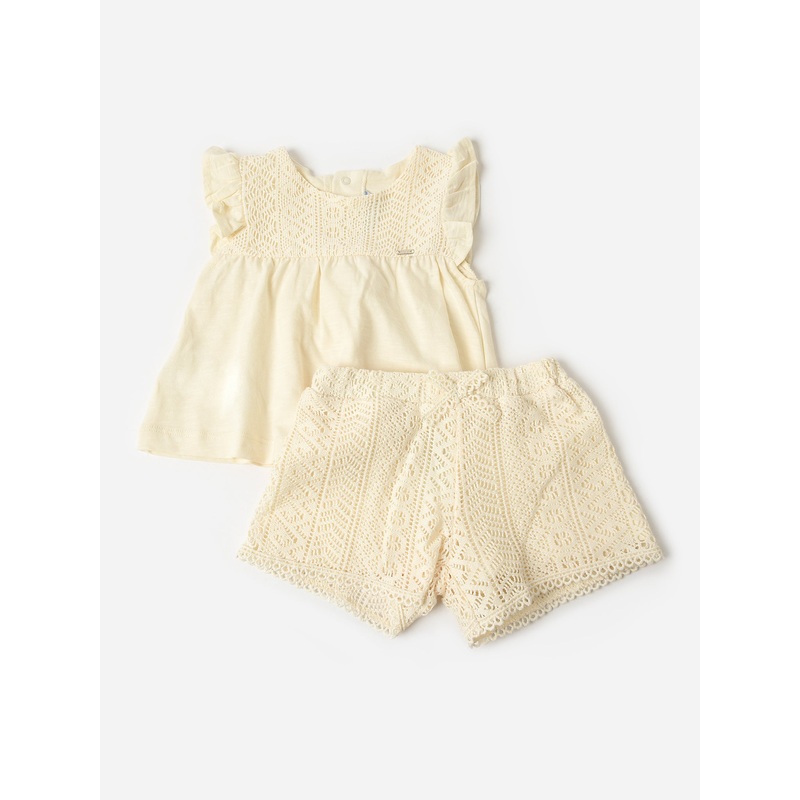 DESCRIPTION:A boho-inspired eyelet lace top and short set FEATURES:Round NecklineRuffle SleevesBack ClosureEyelet Lace YokeMatching ShortElastic WaistbandGuipure Lace FabricCotton/PolyamideClassic Fit