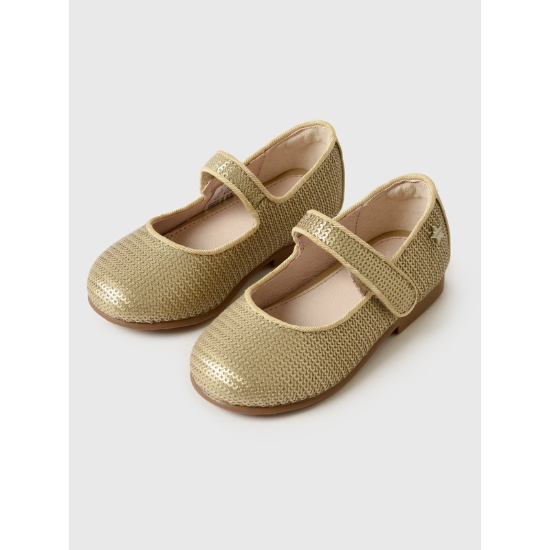 DESCRIPTION:A gold sequin ballet flat with an easy on-and-off velcro closure.