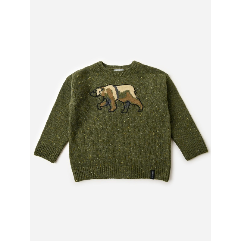 DESCRIPTION:A soft crewneck sweater made with speckled yarn with a custom bear graphic.