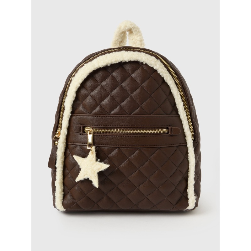 A faux leather backpack with a quilted design and soft sherpa trims.