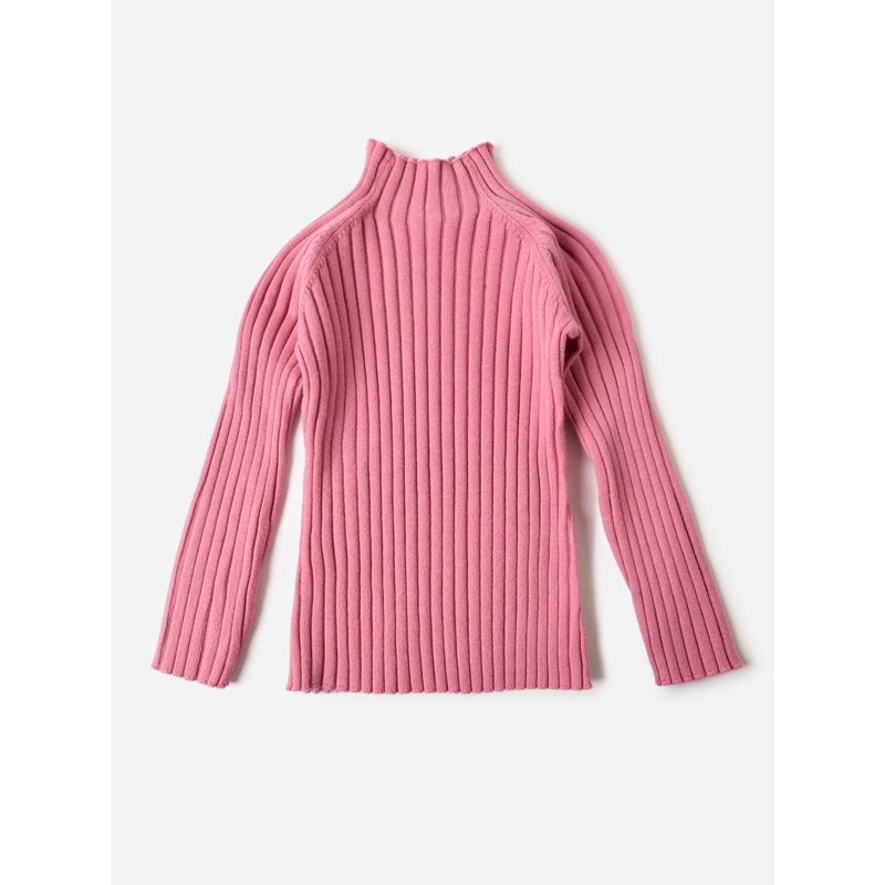 A mock neck sweater made from soft ribbed fabric with lettuce-edge trims.