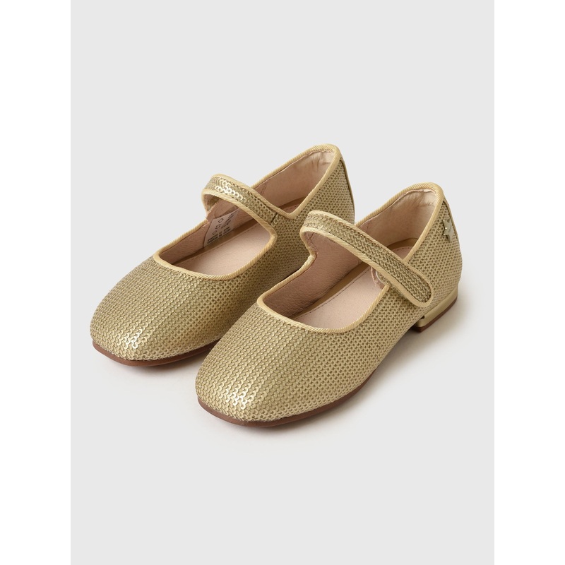 DESCRIPTION:A shimmery ballet flat made with gold sequins and an easy velcro closure.