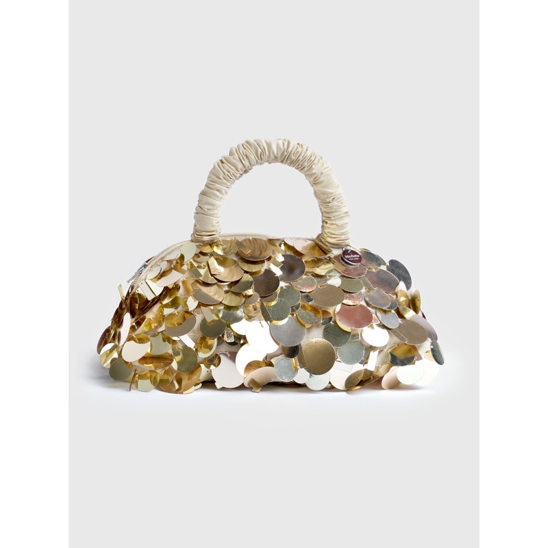 DESCRIPTION:This handmade piece features intricate embroidery with multi-sized sequins that catch the light with a soft golden glow. A ruched satin handle offers tactile contrast and easy wear, complemented by a Merlette logo charm.FEATURES:Ruched HandlesZ