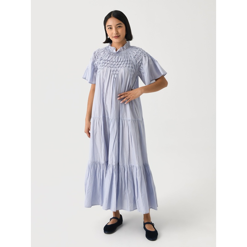 A long and flowy dress made from Pima cotton lawn with flutter sleeves and intricate star-pointed smocking at the yoke.