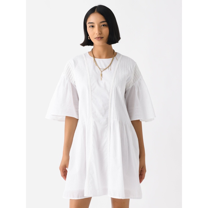 A lightweight cotton voile dress with feminine ruffle sleeves, pintuck panels, and intricately embroidered lace trim.