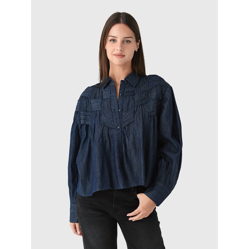 DESCRIPTION:Crafted from cotton denim, this top features intricate, ruched handwoven details on the yoke, giving it a unique texture and a structured yet soft feel. It has a classic collared neckline, a button front, and full-length sleeves with button cuf