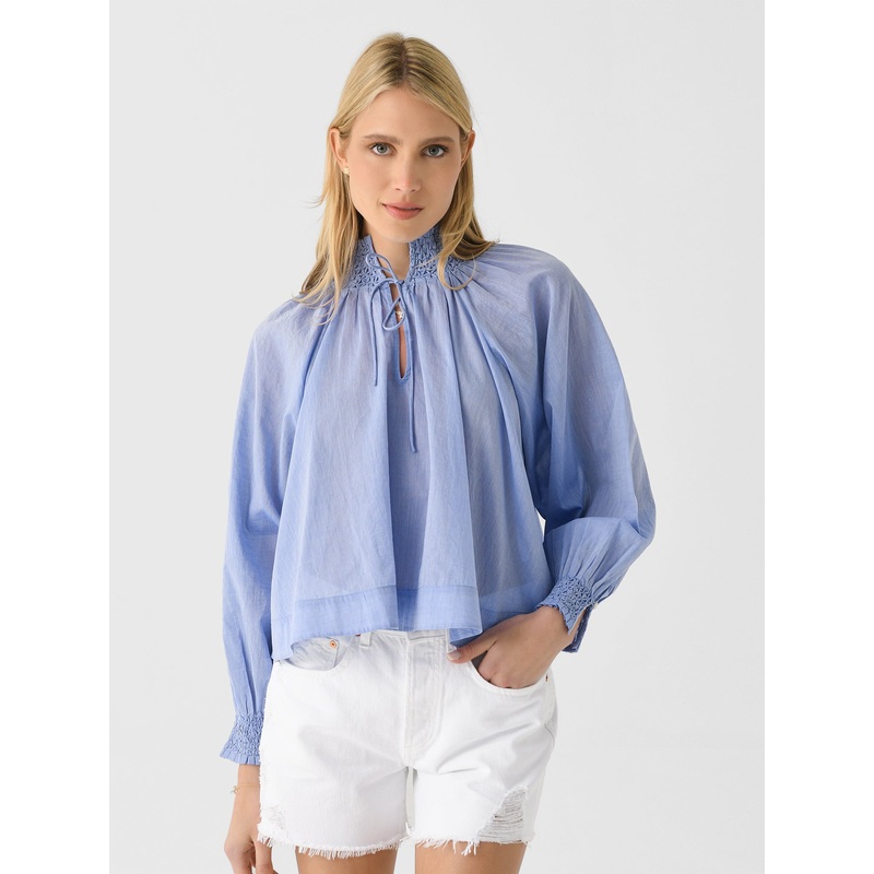 DESCRIPTION:A light and flowy blouse with a slightly cropped design and honeycomb smocked details at the neckline and cuffs.FEATURES:Self-Tie NecklineBlouson SleevesButton CuffsSmocked TrimsCropped Silhouette100% Cotton ChambrayRelaxed FitModel is wearing