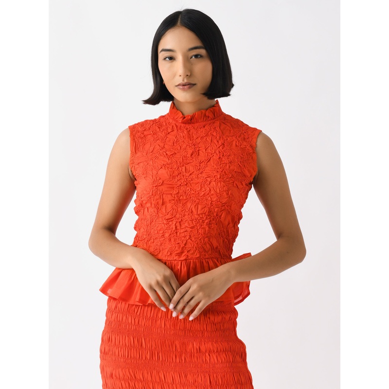 A lightweight sleeveless smocked top with a high ruffle neckline and peplum hem.