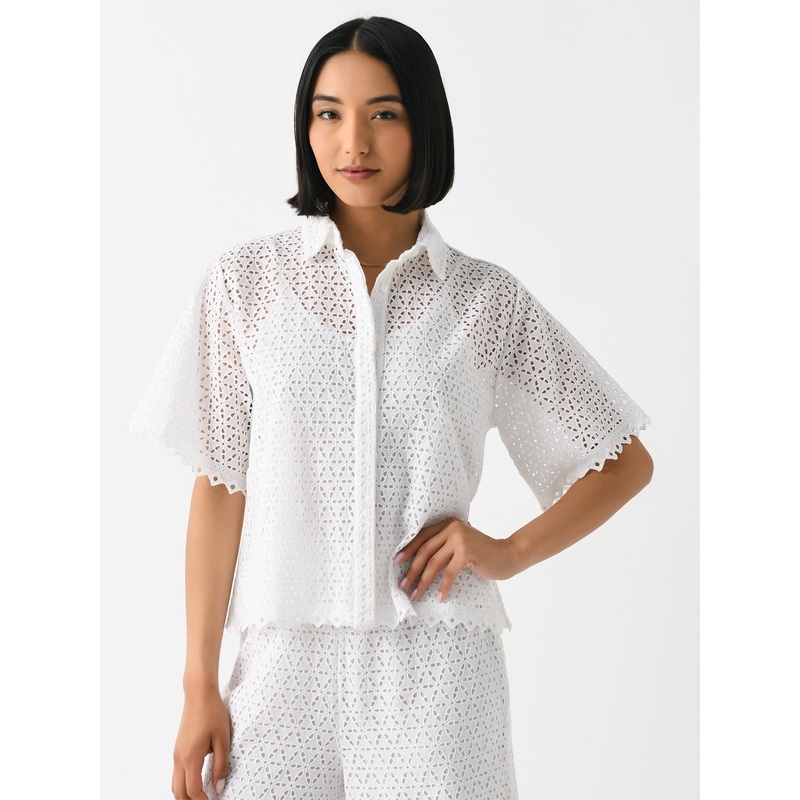 A short-sleeve blouse constructed from eyelet embroidery fabric with a hidden button-down placket.