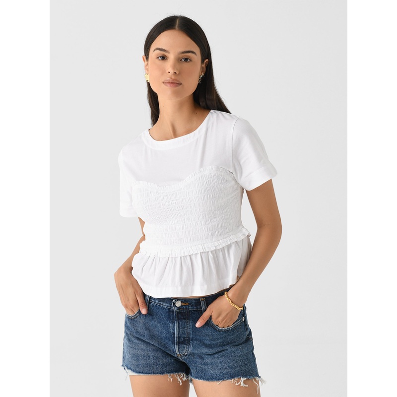 DESCRIPTION:A versatile top made from soft cotton fabric. A textured bodice creates visual interest and a flattering silhouette, while a peplum-style hem adds a feminine touch. FEATURES:Round NecklineShort SleevesSmocked BodiceRuffle TrimPeplum Hem100% Cot