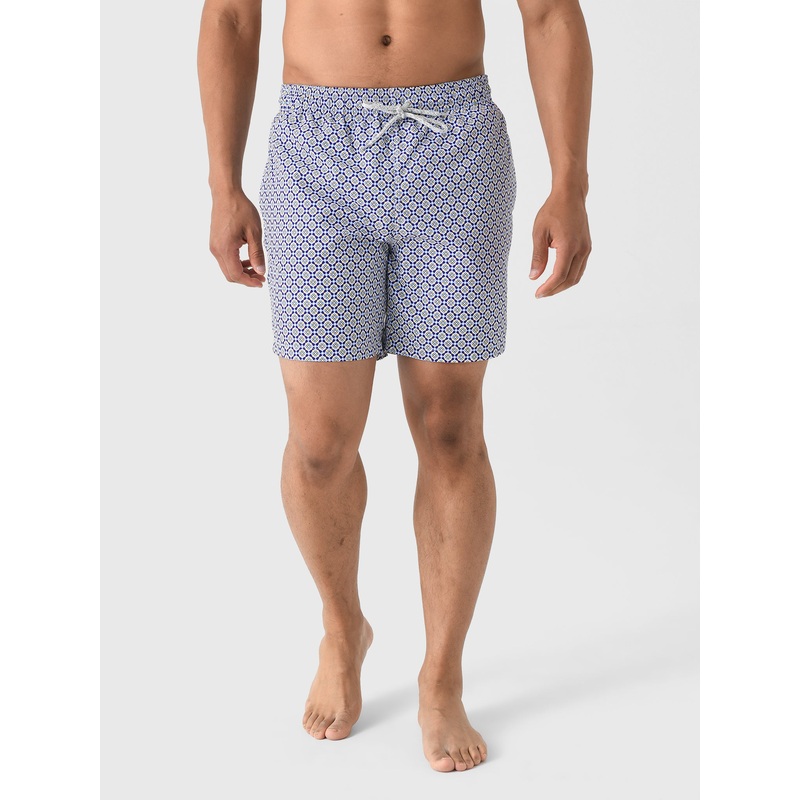 A comfortable swim trunk made from soft peached fabric featuring a custom print.