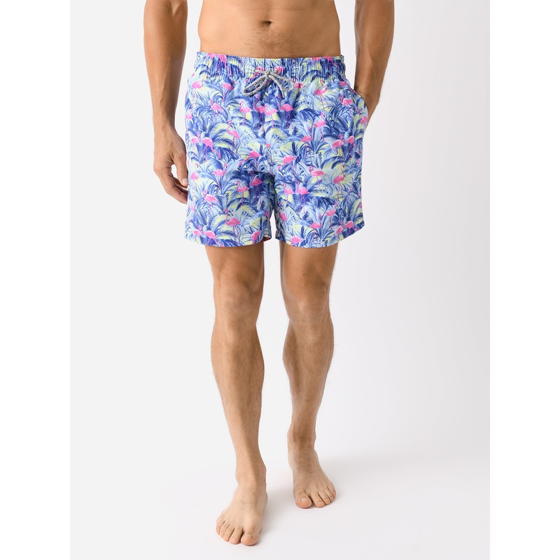 DESCRIPTION:A soft peached swim trunk with a mesh cyclist liner and colorful flamingo-inspired print.FEATURES:Elastic WaistbandAdjustable DrawstringSide PocketsBack PocketCyclist LinerAll-Over Novelty PrintQuick-Drying100% PolyesterClassic FitModel is wear