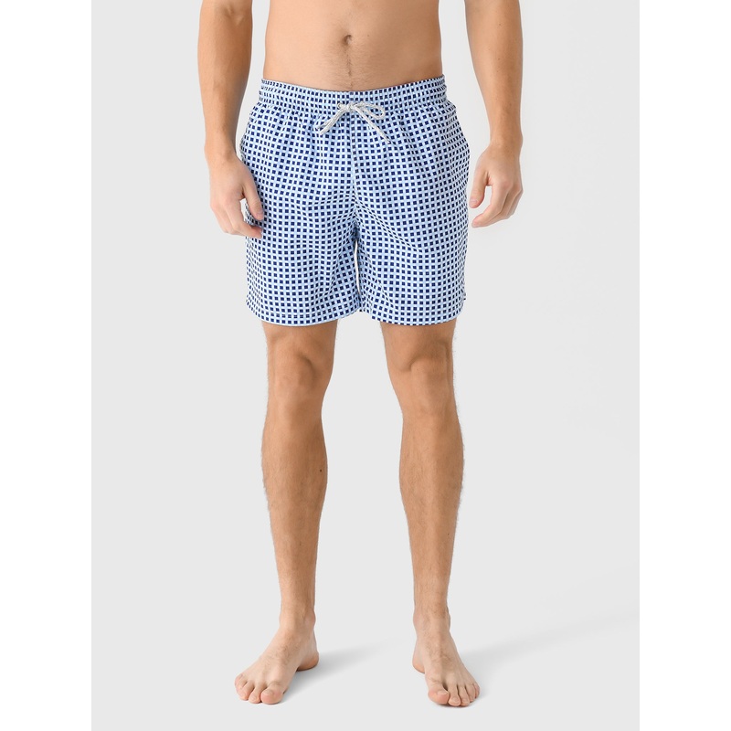 This stylish swim trunk features a classic blue and white checkered pattern for a timeless look that never goes out of style.