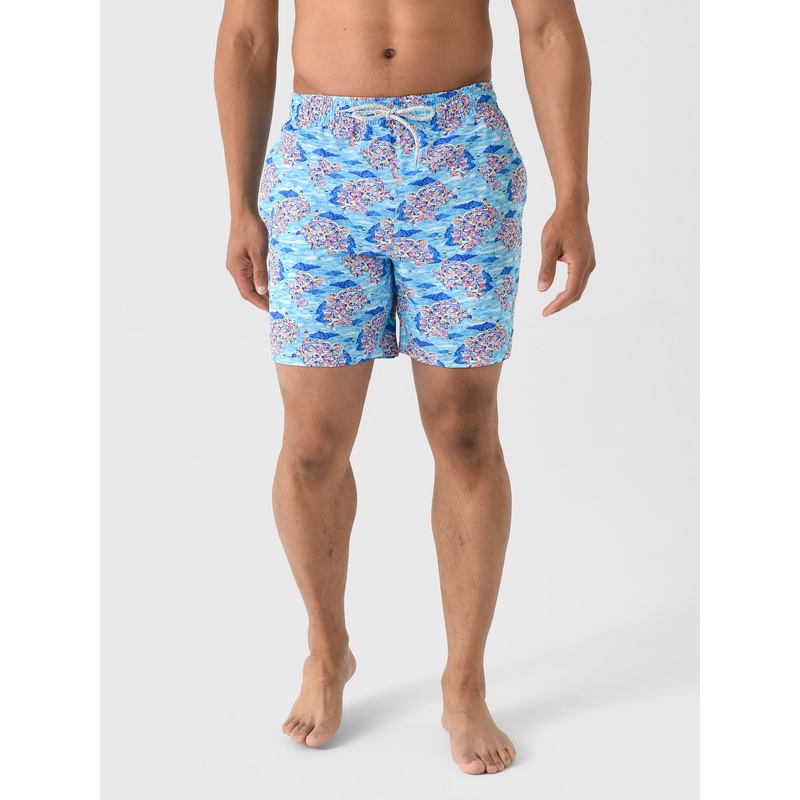 A comfortable swim trunk made from quick-drying brushed fabric featuring a colorful print inspired by the island of Santorini.
