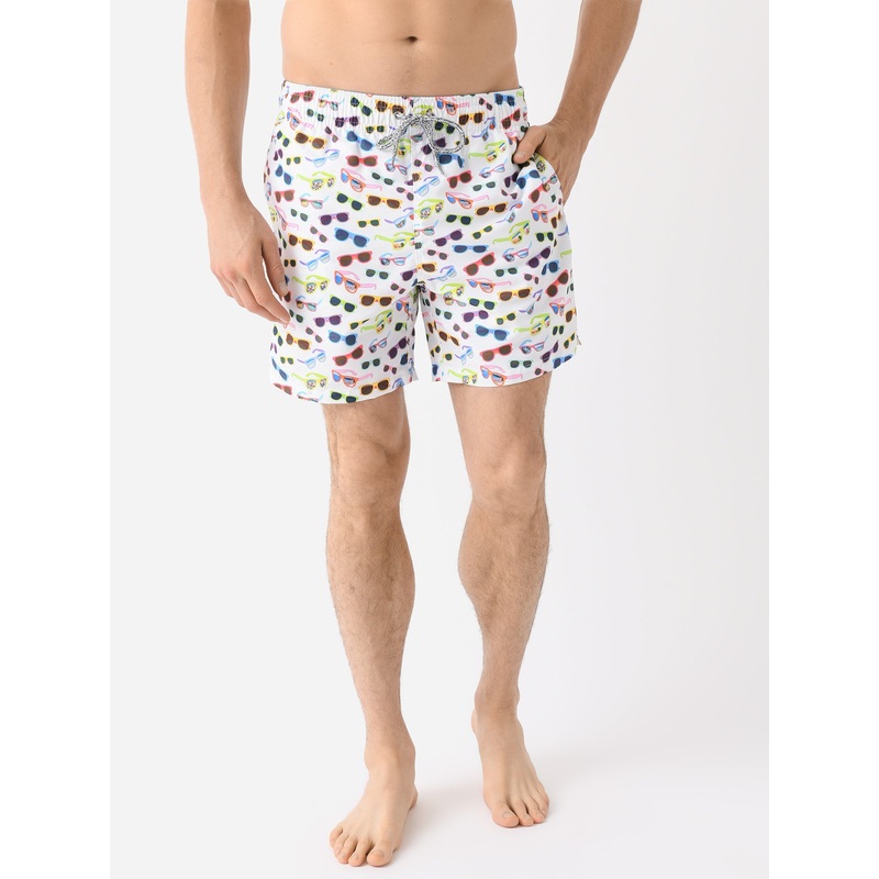 A quick-drying swim trunk made from soft brushed fabric featuring a mesh cyclist liner and a colorful sunglasses print.