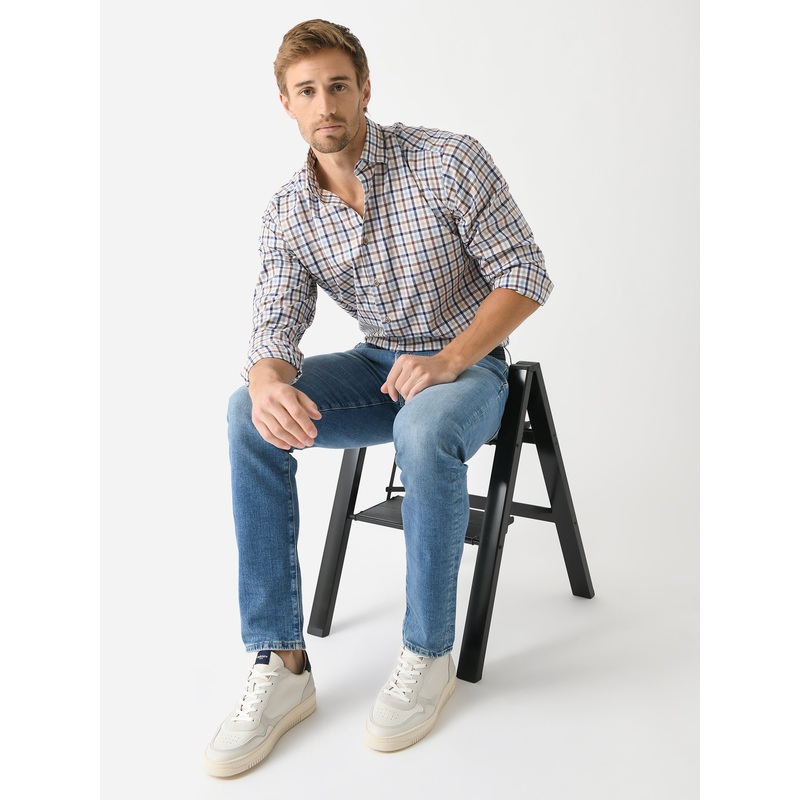 A classic button-down shirt made from plaid-printed breathable cotton fabric.