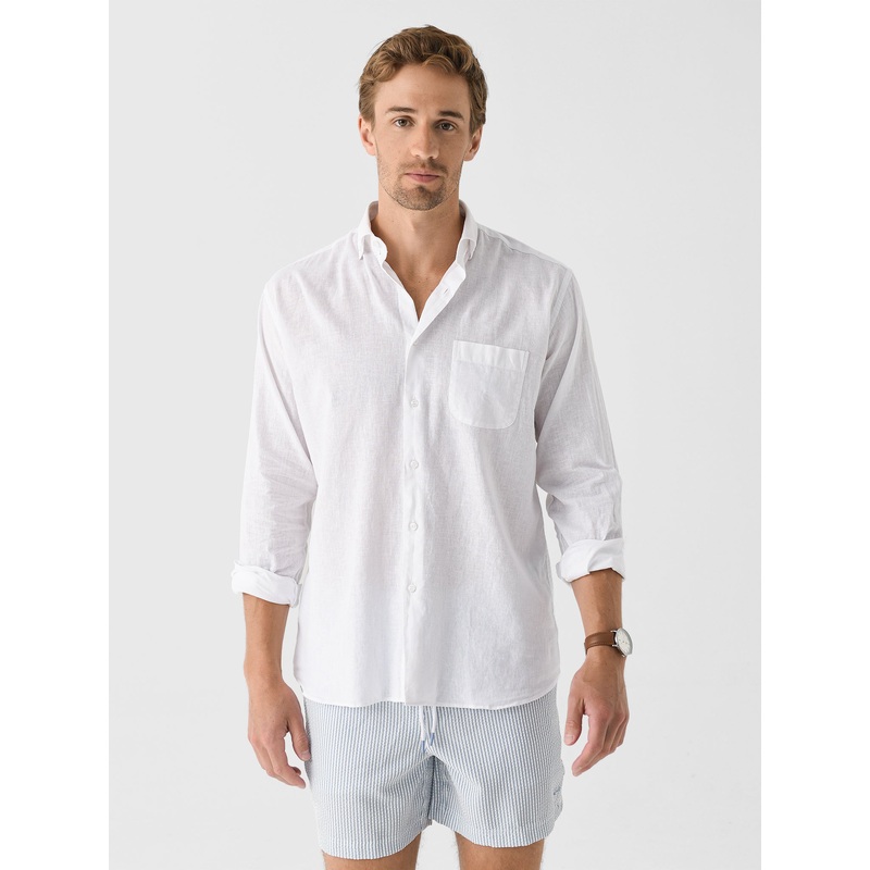 DESCRIPTION:A simple button-down shirt made from a soft linen and cotton blend.FEATURES:Spread CollarButton CuffsButton-Down PlacketCurved Hem55% Linen, 45% CottonClassic FitModel is wearing size Medium shirt. Blue, Purple, White: Model's Measurements: Hei